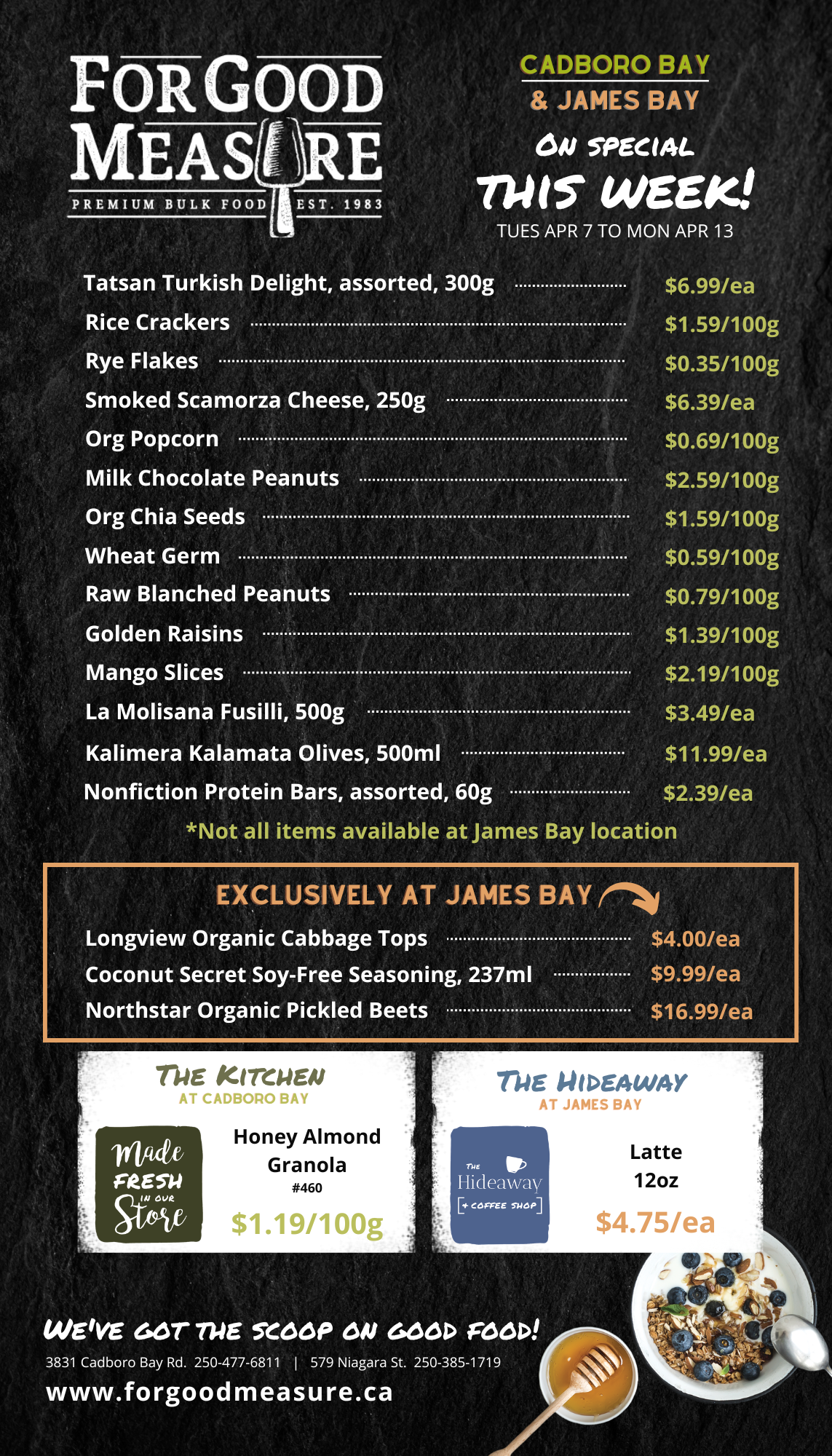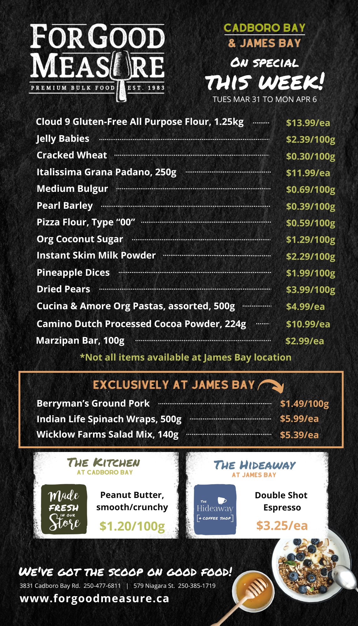For Good Measure Cadboro Bay is Victoria's original bulk food store. Started in 1983, what was originally the Cadboro Bay Bulk Food Store, became For Good Measure Premium Bulk Food in 1994.